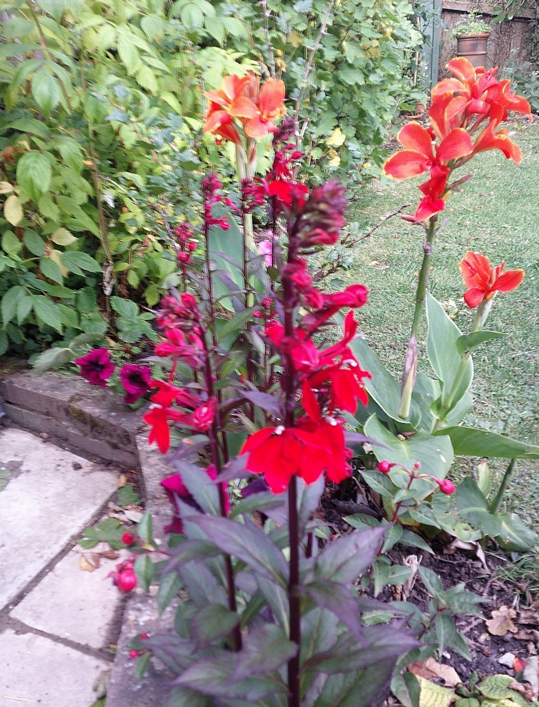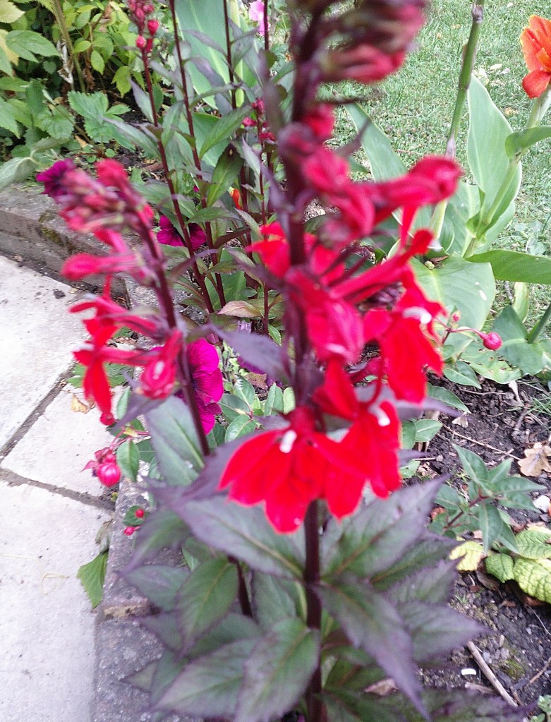 If like me, you thought lobelias were little blue flowers that people put in their hanging baskets to trail over the edge, be prepared for a surprise. These are tall and bright red!